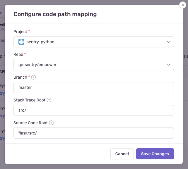 • Repo (required): This is the GitHub repository associated with the Sentry project above. If you have more than one GitHub repository being used per Sentry project, you'll need multiple code mappings.