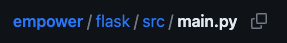 Next, locate the file seen in the stack trace with your source code provider (e.g. GitHub). In this example, the path is flask/src/main.py (empower is ignored since it is the name of the repo).