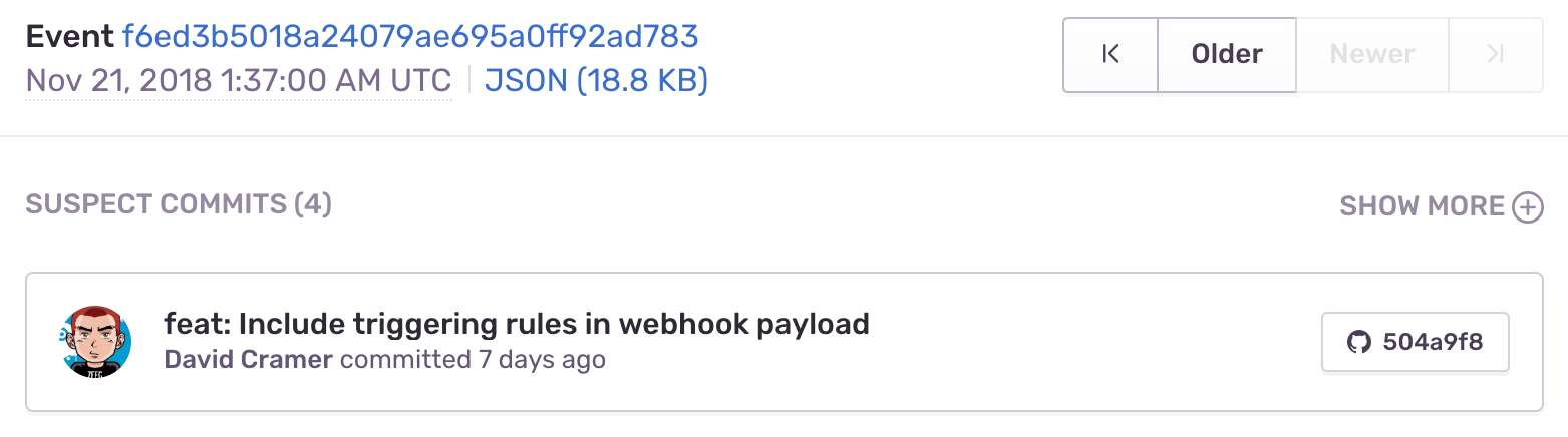 For issues where the files in the stack trace match files included in commits sent to Sentry, you’ll see the suspect commit, with a link to the commit itself.